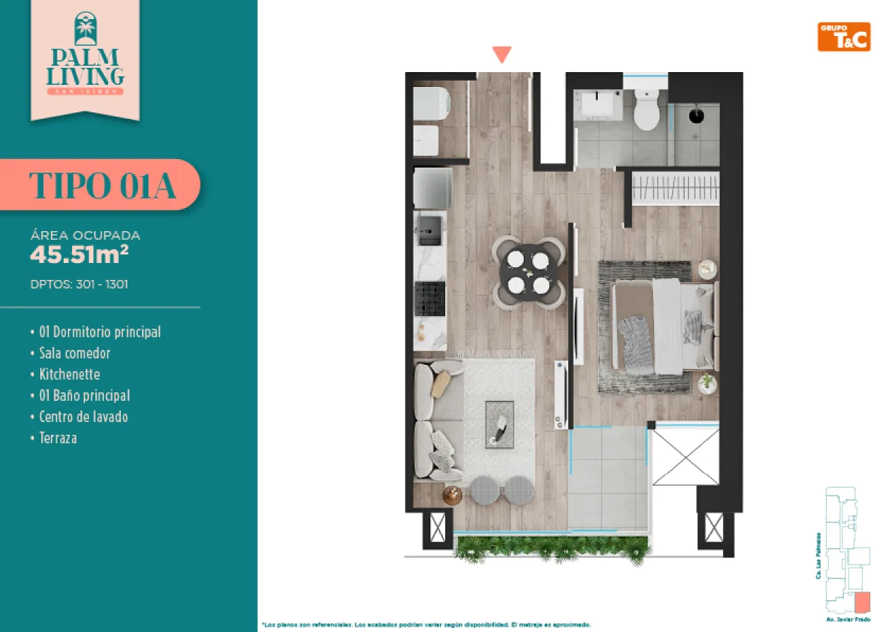 Tipo 1A1 dormitorios / Área total 45.51 m2